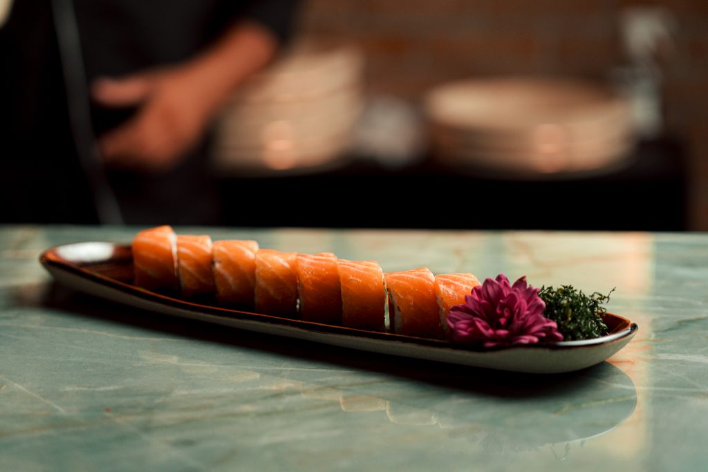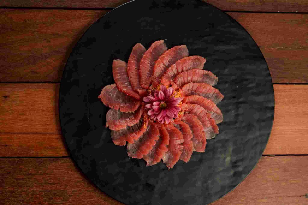 Nas entradas, o restaurante oferece opções como carpaccio de barriga de salmão preparado com azeite trufado e limão siciliano, tartar de atum ou salmão com molho fusion levemente picante, sunomono de salmão com pepino marinado e cubos de peixe fresco, e edamame (vagens) finalizado com azeite trufado.